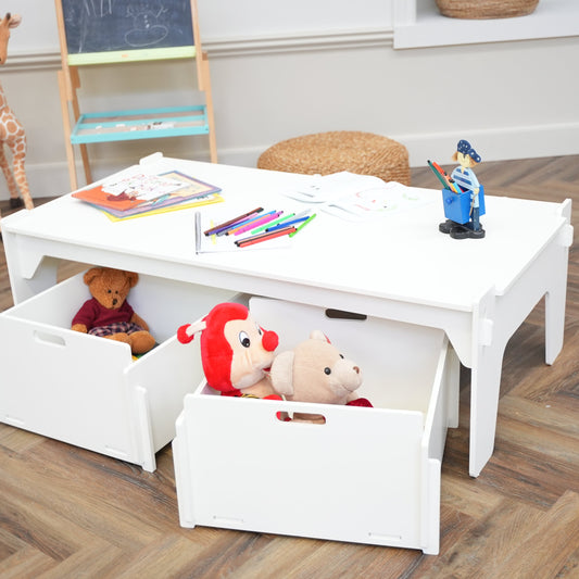 Kijk eens naar onze combinatieset met de grote en ruime speeltafel Bjørn en de twee slimme en grote opbergdozen Stine. De opbergdozen zonder deksel kunnen gemakkelijk onder de tafel worden geschoven wanneer er niet wordt gespeeld. Zo ziet alles er netjes en opgeruimd uit - zonder al te veel ruimte in beslag te nemen.