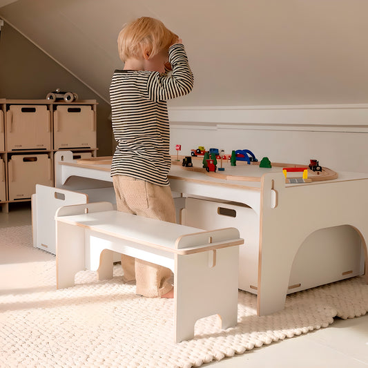 Met onze kindertafels en kinderkrukjes creëer je eenvoudig een speelhoek in de woonkamer. De houten meubelen passen mooi in elk interieur, zonder dat ze gewelddadig overkomen in de inrichting. En dan kun je een kinderbankje met opberger aanschaffen, zodat het speelgoed snel opgeborgen kan worden en het er snel opgeruimd uitziet als de kinderen naar bed worden gebracht. U kunt ook kiezen voor ons bureau Augusta, geïnspireerd op de schoolbanken uit die tijd. Dit kleine bureau is zeer praktisch omdat het gemakkelijk kan worden verplaatst, afhankelijk van waar het kind wil zitten om te tekenen en schilderen. En bovendien is hij gemakkelijk uit elkaar te halen en mee te nemen als je op bezoek gaat of in een vakantiehuisje, zodat het kind een eigen zitje heeft. Al onze tafels, stoelen en banken worden zonder gereedschap in elkaar gezet en het geheel is eenvoudig uit elkaar te klikken, zodat het kan worden opgeborgen als de ruimte voor iets anders moet worden gebruikt.