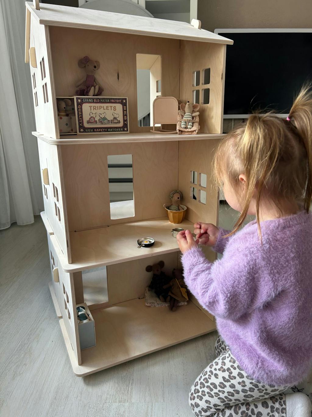 Geen gedoe met montage. In een mum van tijd heb je het in elkaar gezet. De kinderen vinden het fantastisch om samen, maar ook om zelf te spelen aan hun eigen kant. De afmetingen zijn ook goed voor de muizen van Maileg.