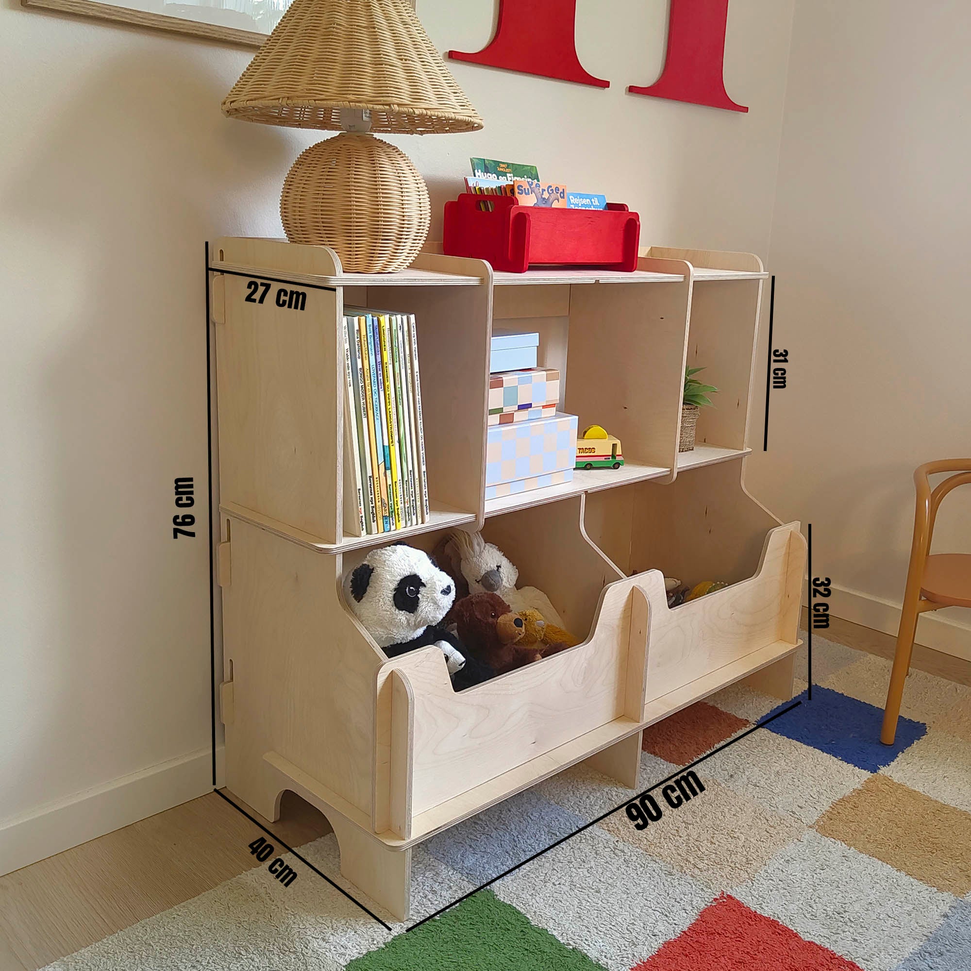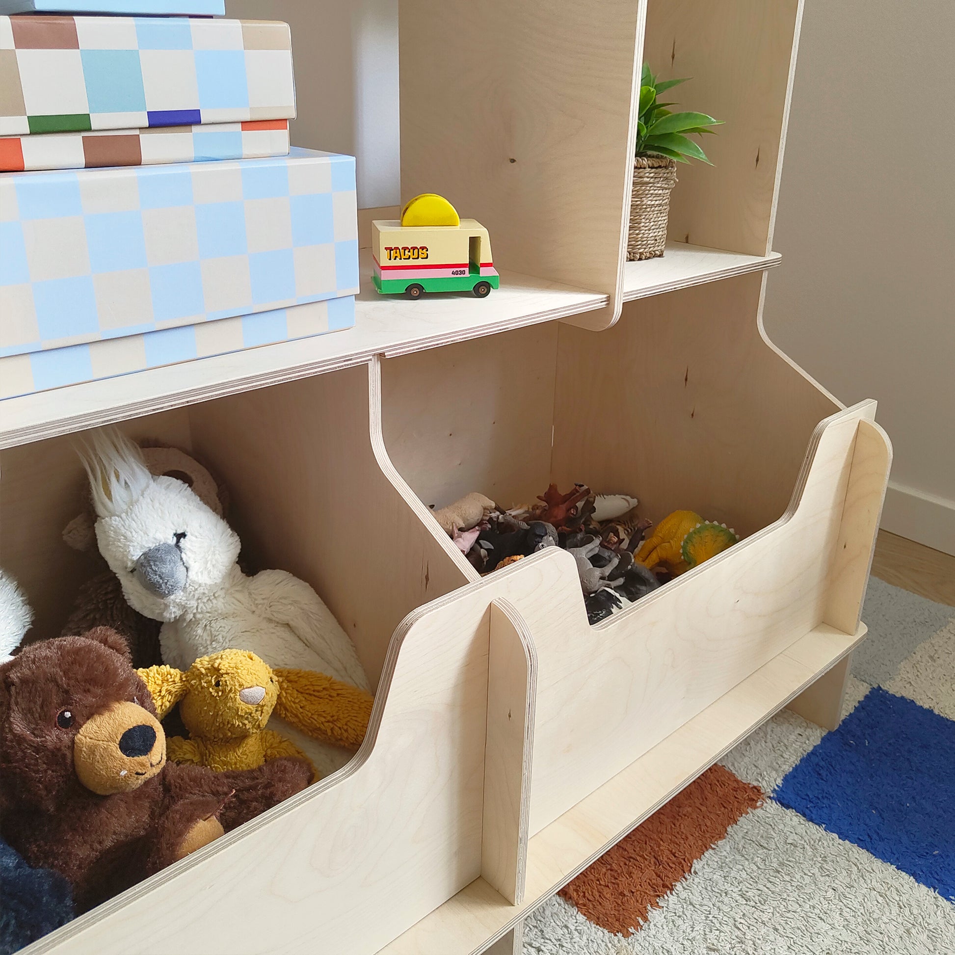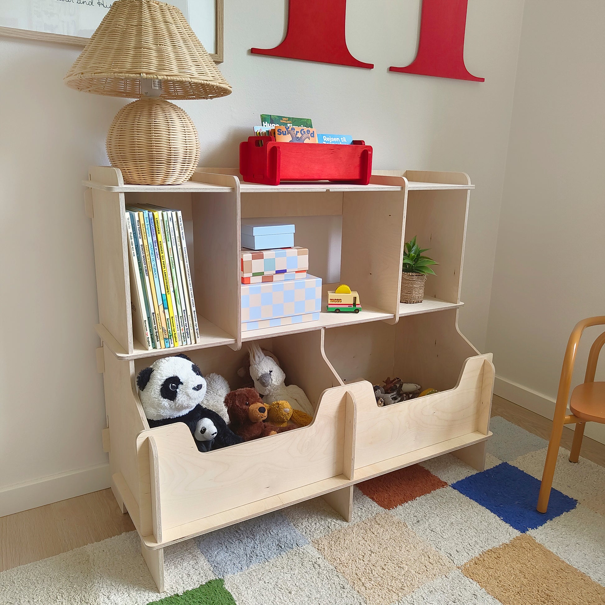 Maak kennis met Saxo, onze praktische kast voor de kinderkamer. Met twee grote opbergbakken onderaan en planken op kinderhoogte kunnen kinderen van 1–6 jaar gemakkelijk hun favoriete boeken, knuffels en speelgoed pakken – en net zo eenvoudig weer opruimen.