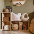 Boekenkast, bankje, speeltafel. We hebben geprobeerd een multifunctioneel meubelstuk te creëren dat veel opbergruimte biedt voor alle spullen in de kinderkamer. Met veel ruimte voor boeken, spelletjes, opbergdozen en nog veel meer.