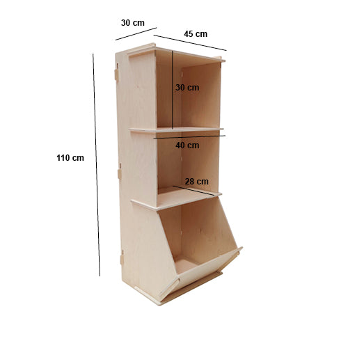 Schuine voorkant met extra functie: Het bijzondere aan Oscar is de schuine voorkant aan de onderkant, die niet alleen als plank fungeert, maar ook als een praktische opbergdoos. Hier kun je alles opbergen, van bouwstenen tot keukenspullen, poppenkleertjes en verkleedkleren, zodat het allemaal bij de hand is.